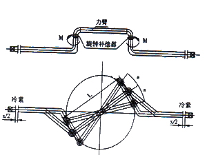 旋轉(zhuǎn)補償器的補償原理與鉸鏈型波形膨脹節(jié)相似,要用兩個或者兩個以上的補償器組合,利用其角位移的變化才能補償位移。兩者_的不同_是:鉸鏈型波形膨脹節(jié)是靠波紋管的變形產(chǎn)生角位移的,而旋轉(zhuǎn)補償器是靠旋轉(zhuǎn)管的旋轉(zhuǎn)產(chǎn)生角位移的,它需要一個力(由管道熱膨脹產(chǎn)生)和一個力臂形成一個力矩才能推動其旋轉(zhuǎn)。因此,它不能與管道中心線同心,而應與其垂直,這樣才能通過設置一個力臂連接兩個旋轉(zhuǎn)補償器。當一端管道熱膨脹推動力臂沿一個旋轉(zhuǎn)補償器旋轉(zhuǎn)時產(chǎn)生一個力矩,連接力臂另一個的旋轉(zhuǎn)波紋補償器產(chǎn)生一個反力矩,一對力矩大小相等,方向相反,形成力偶,達到力的平衡。