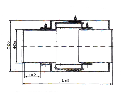 結(jié)構(gòu)特點(diǎn)是:采用三個(gè)填料密封箱;準(zhǔn)確的設(shè)計(jì)一個(gè)封閉流體環(huán)腔,利用流體靜壓力產(chǎn)生對(duì)兩側(cè)管道的拉緊力,抵消管道拐彎或盲端處固定支架上作用的流體推力。這種結(jié)構(gòu),由于流體直通式流懂,所以流體阻力損失很小,安裝長(zhǎng)度短。