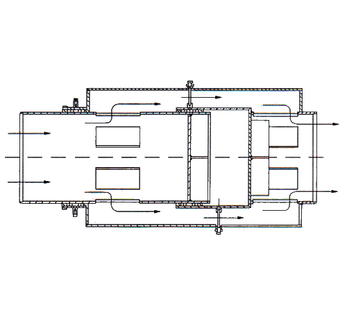 結(jié)構(gòu)特點(diǎn)是:外套管串聯(lián)兩個(gè)填料密封箱,內(nèi)套管后端加擋板,流體經(jīng)內(nèi)套管的孔道引到兩密封箱間隔腔,再經(jīng)外套管間隔腔處孔道,引回到后部加擋板的主管道。這種補(bǔ)償器比平衡腔式補(bǔ)償器減少一個(gè)密封箱,結(jié)構(gòu)簡(jiǎn)單,但比平衡腔型補(bǔ)償器重量大,安裝尺寸長(zhǎng)。