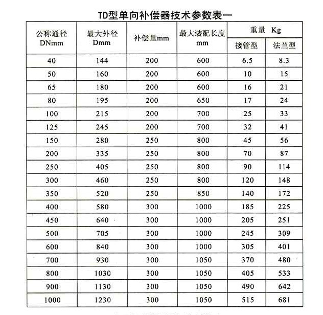 1、TD型單向補(bǔ)償器技術(shù)參數(shù)見(jiàn)表1,結(jié)構(gòu)型式見(jiàn)圖一。