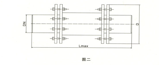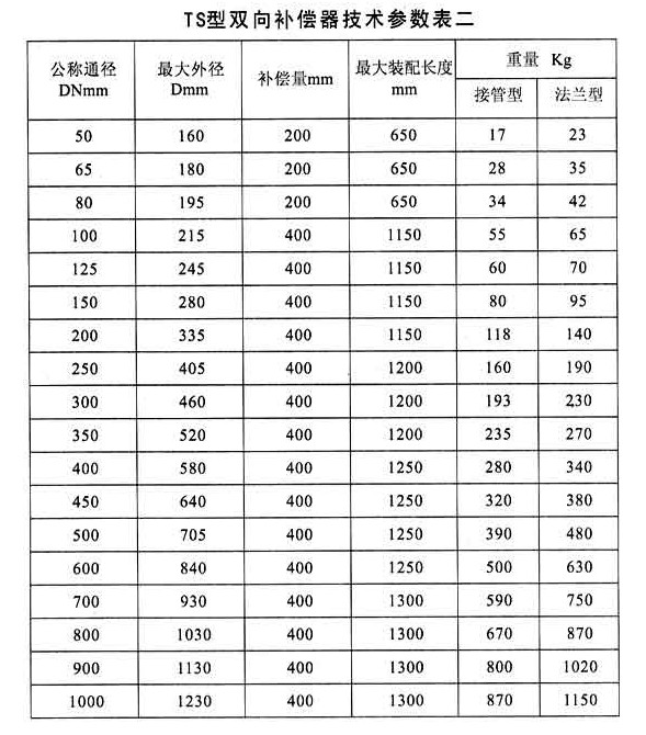 2、TS型雙向補(bǔ)償器技術(shù)參數(shù)見(jiàn)表2,結(jié)構(gòu)型式見(jiàn)圖二。