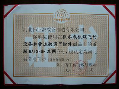 熱烈慶祝河北偉業波紋管制造有限公司,百順牌波紋管,波紋補償器,膨脹節,伸縮節榮獲2011~2017年度“河北省_商標”二十多年來我公司一直以_的產品,_的技術,熱情的服務深受國內外客戶的好評。
